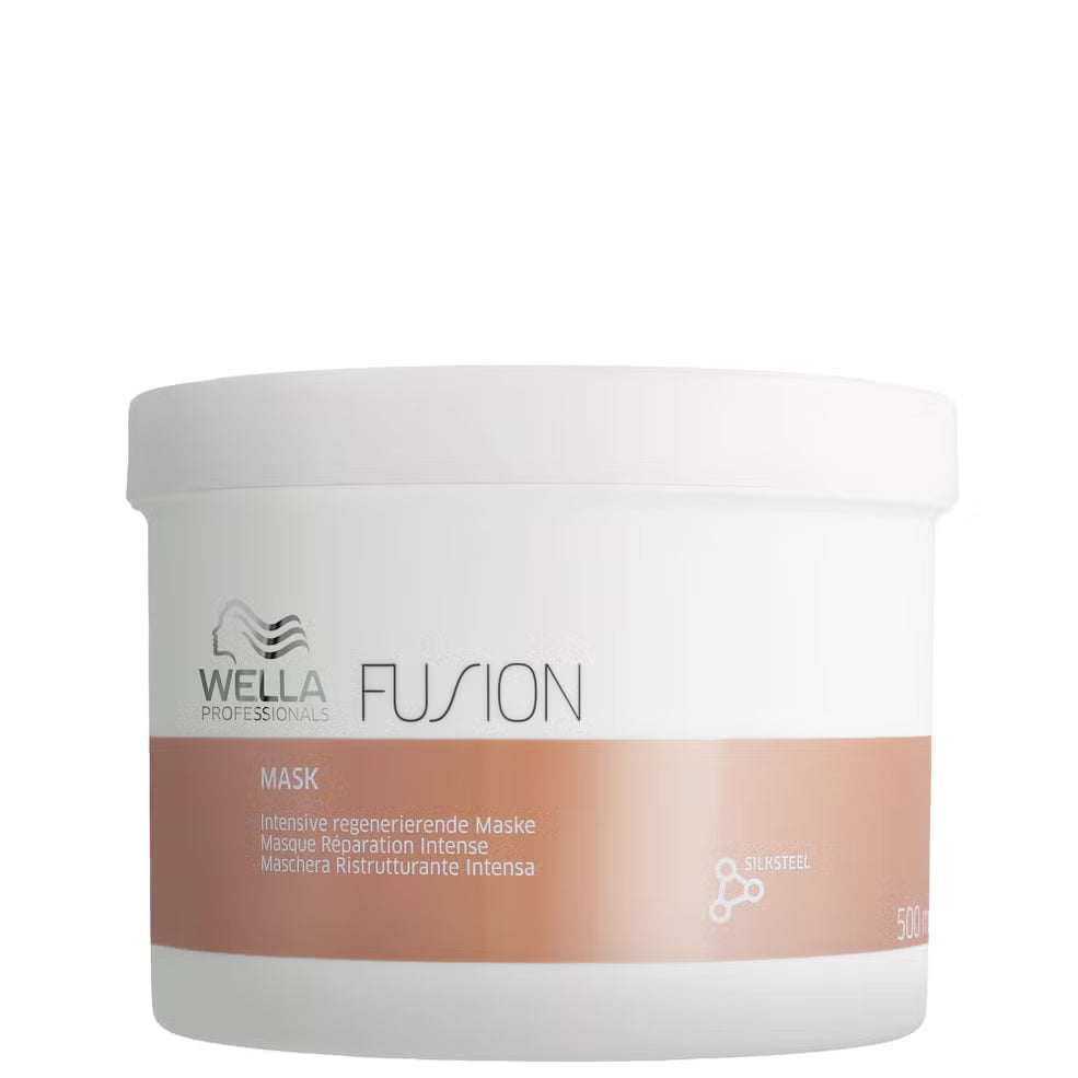Wella Professionals Fusion Intense Repair Hair Mask restores damaged hair in five minutes. Silk amino acids and lipids strengthen and smooth strands, while a Metal Purifier Complex shields against mineral damage. Results include improved manageability, softer texture, and up to 95% less breakage.